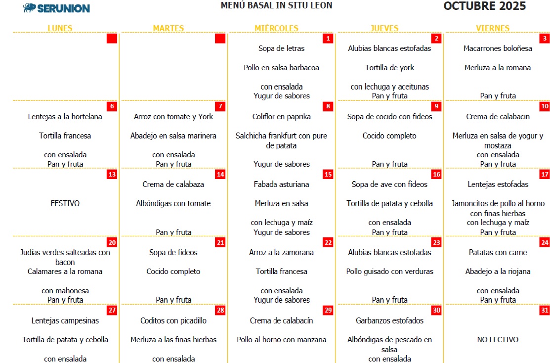 La comida se elabora diariamente en la cocina del colegio acorde con el menú propuesto por la empresa concesionaria del servicio U.T.E. SERUNIÓN, S.A. - GRUPO LINCE ASPRONA, S.L.U.; y que han sido aprobados por la Consejería de Educación.